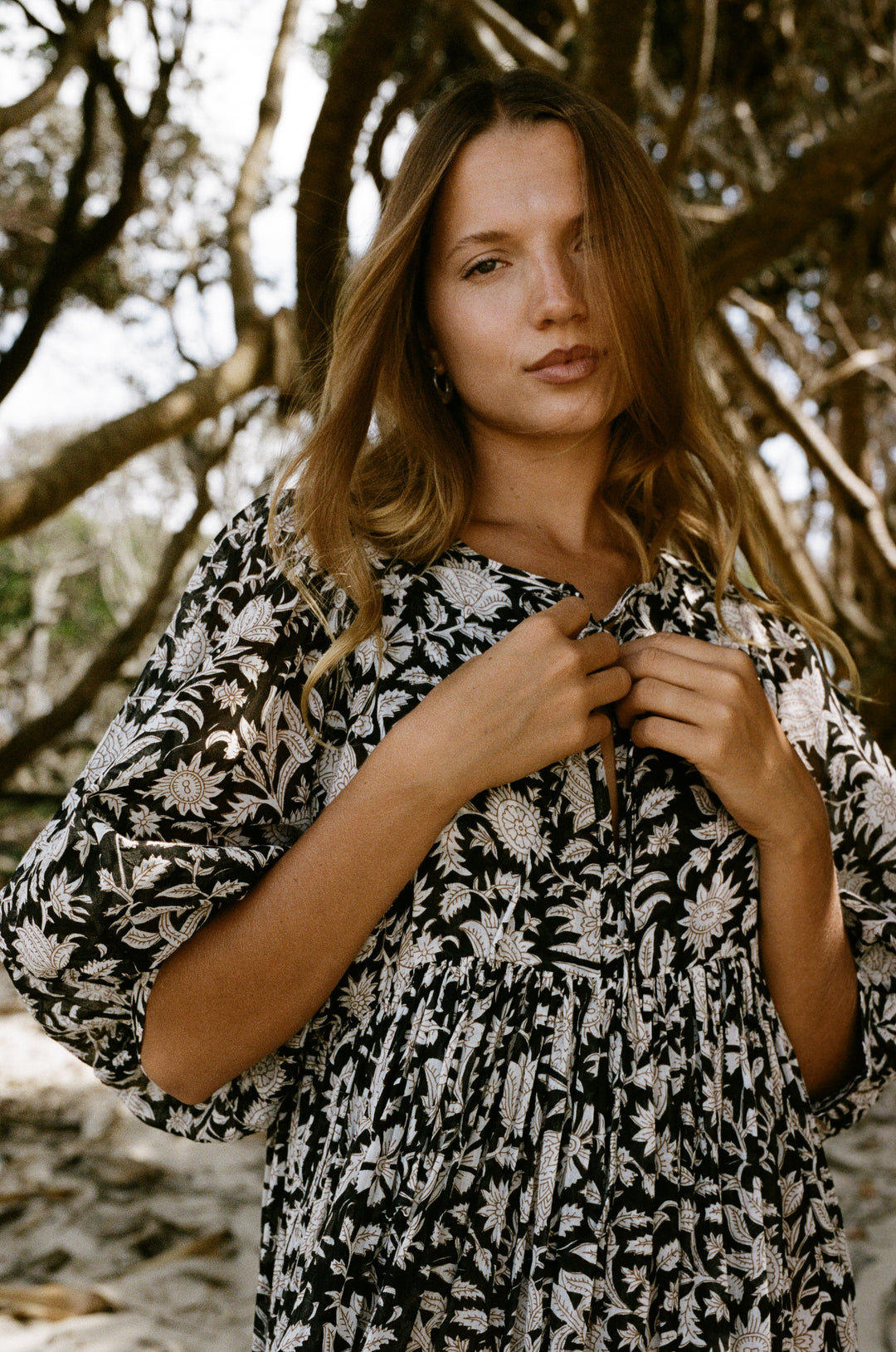 The beauty of block print is stunning on this calf length midi dress. A flattering feminine design featuring romantic billowing sleeves and a full bodied skirt free of underlining, making it the most comfortable style due to the heavenly soft lightness of the material. With optional front tie detailing at the bust, this design is both maternity and breast-feeding friendly.