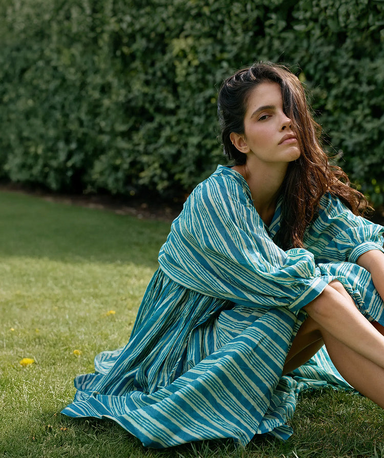 Daughters of India Kyra Midi Dress in Ocean Blue — seated in bamboo beach hut, hand screen print cotton Daughters of India Kyra Midi Dress in Ocean Blue — close-up billowed sleeve by ocean, hand screen print detail