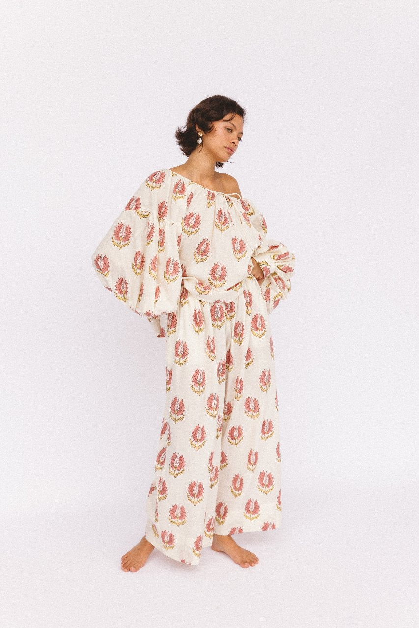 The Ria Pants are ethically handcrafted with 100% cotton into the most comfortably soft and unrestrictive design. Featuring an elasticated waist, pockets, and elegantly oversized silhouette. Adorned with hand placed florals, the making of these pants serves to support the preservation of hand craftsmanship and women empowerment in India.